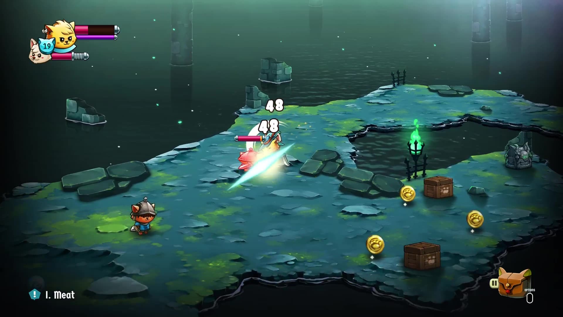 Combat remains the focal point of Cat Quest II, and it’s just as fun as the first game. The dodge-and-strike rhythm is responsive and satisfying, making the game easy to pick up for quick sessions. Spells play a much bigger role this time, adding welcome variety and allowing for different combat styles. Shrines across the world unlock new magic, and with the ability to bind spells to specific shoulder buttons, it’s easy to tailor your loadout. You can mix defensive and offensive magic or specialize heavily in one direction. Your cat and dog hero are on the screen together, so you can outfit them both with specific gear or spells which gives you great freedom when it comes to building loadouts and playstyles.