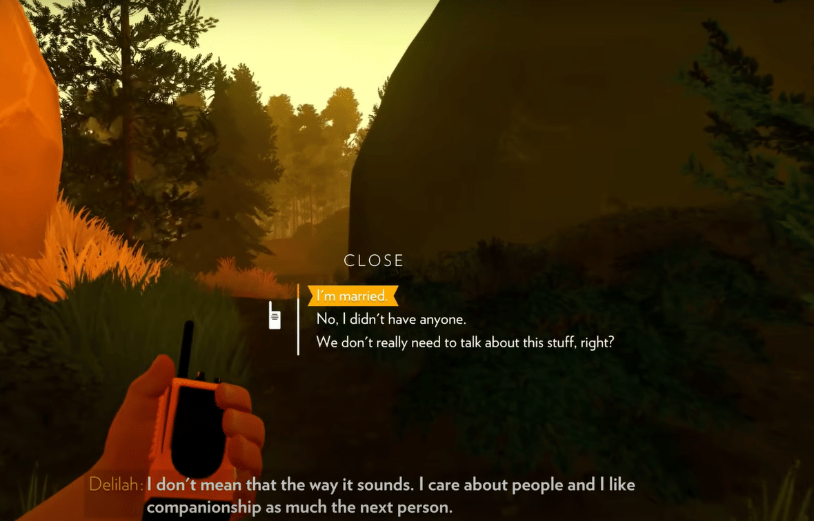 Firewatch is a first-person narrative adventure that's set in the Wyoming wilderness in the late 1980's. Players take control of Henry, a man who takes a job as a fire lookout in order to escape the pressures of his personal life. We learn in the first few minutes of the game that Henry's wife Julia has become ill and is now living with her parents. Henry has a hard time dealing with this and everything that's lead to this moment, and it largely drives his desire to seek solitude, and the job of a secluded fire watcher seems to be exactly what he needs. Over the course of the game, Henry will interact with his supervisor Delilah via a handheld radio, and much of the game is built upon Henry and Delilah's interactions. As the game goes on, Henry and Delilah form a deep, evolving bond with one another. Each of them are struggling with issues in their own lives and how they learn about each other and connect through their shared but differing backstories is the heart of the game's experience. The best part about these conversations is the game gives you the ability to shape your relationship with Delilah based on how you respond in conversation or what information you choose to reveal about yourself.