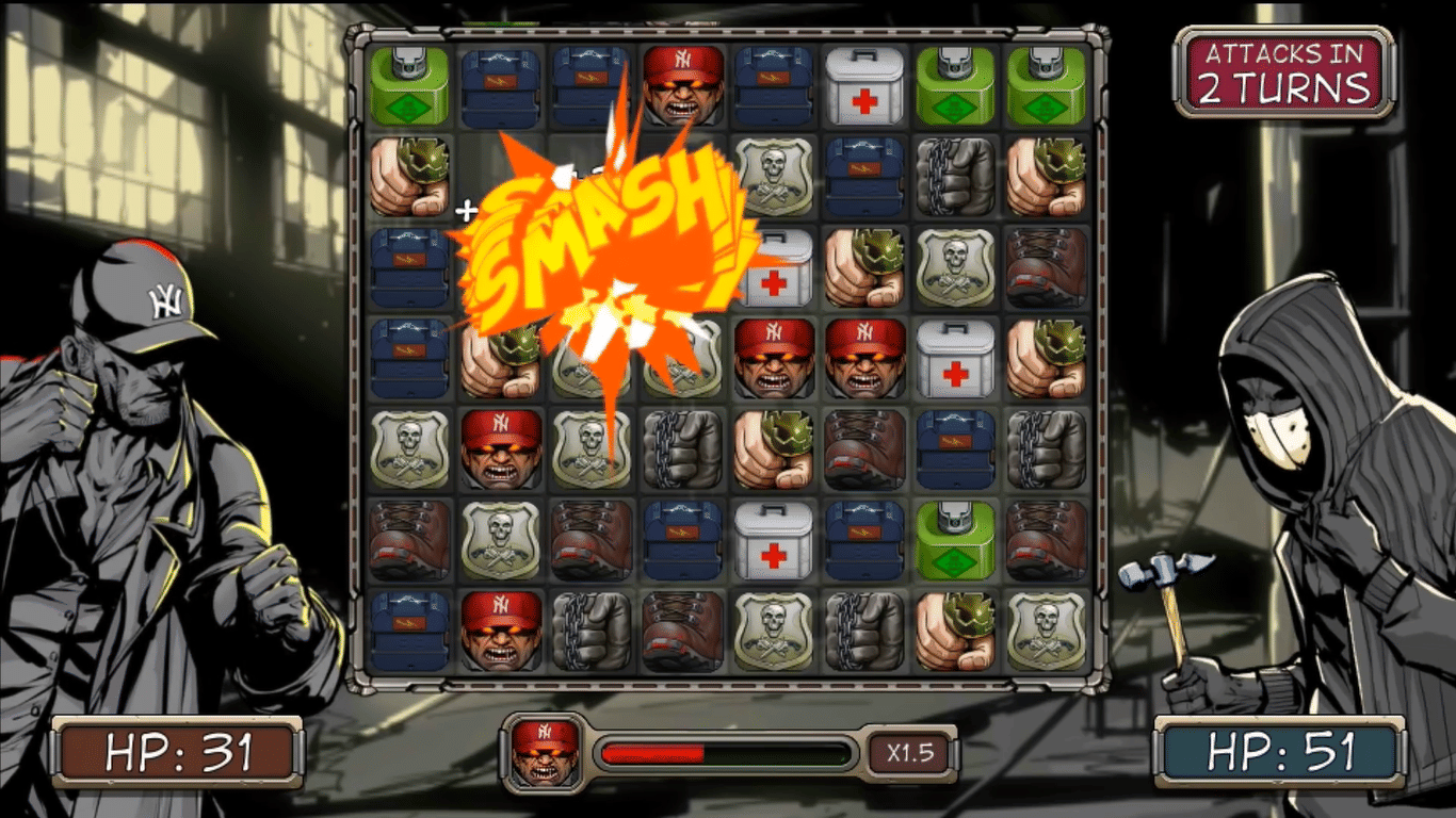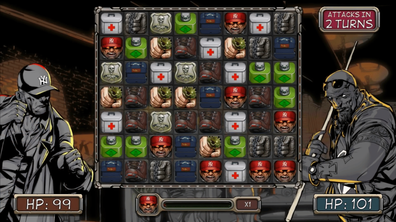 Now here’s where things get interesting. Underneath the trench coats and moral corruption lies a genuinely fun match-3 puzzle/combat system. When your main character throws down with someone in the story, the fight plays out on a puzzle board. Match three fists to punch your opponent. Match three boots to kick 'em in the face. Match health kits to restore your health. Match skulls and you hurt yourself. Build up your “anger” meter to increase damage output.