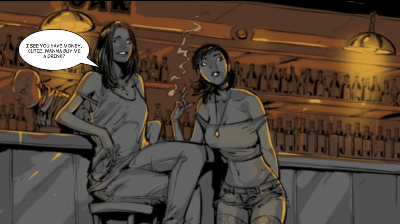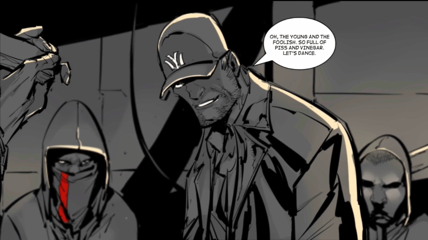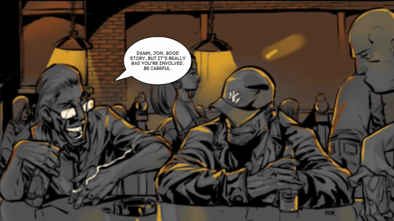 The story plays out like a gritty graphic novel. Conversations unfold in comic panels that are slightly animated. Choices appear at key moments, letting you decide how Jon responds in certain situations. These choices decide who he sides with, who he pushes away, and how deep he’s willing to sink to survive.